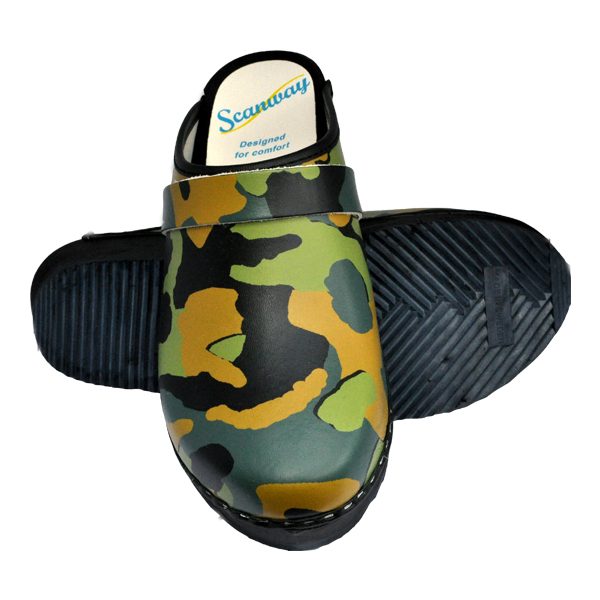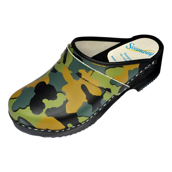This Camo printed style clog is made with a smooth quality leather upper. The base is the original Standard wooden sole, which is shaped to offer support and even weight distribution. Strongly recommended for nurses, hair designers, estheticians, chefs, teachers etc.